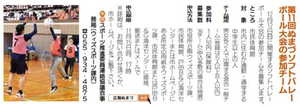 続いて2つ目は、12月12日(日)に市民体育館で開催される「第11回ぬまづソフトバレーボール大会」です。