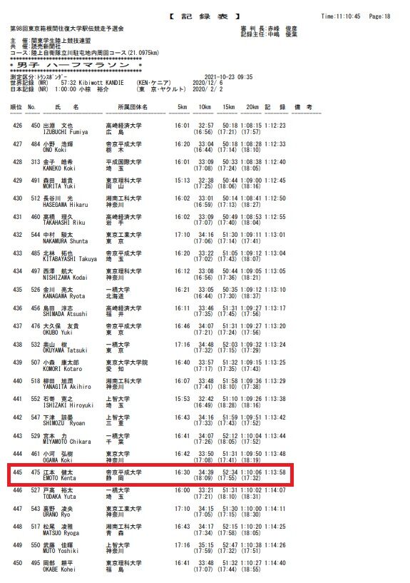 【結果速報】2022箱根予選会、帝京平成大と江本選手(金岡中卒)の結果は?