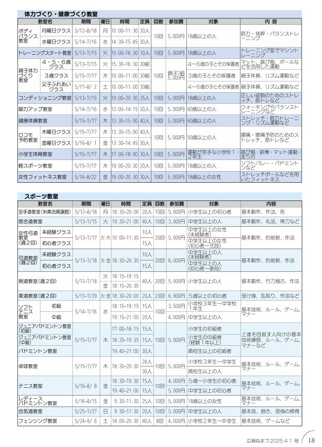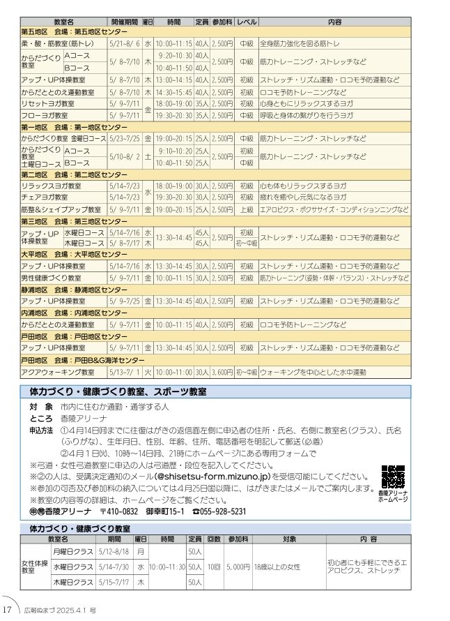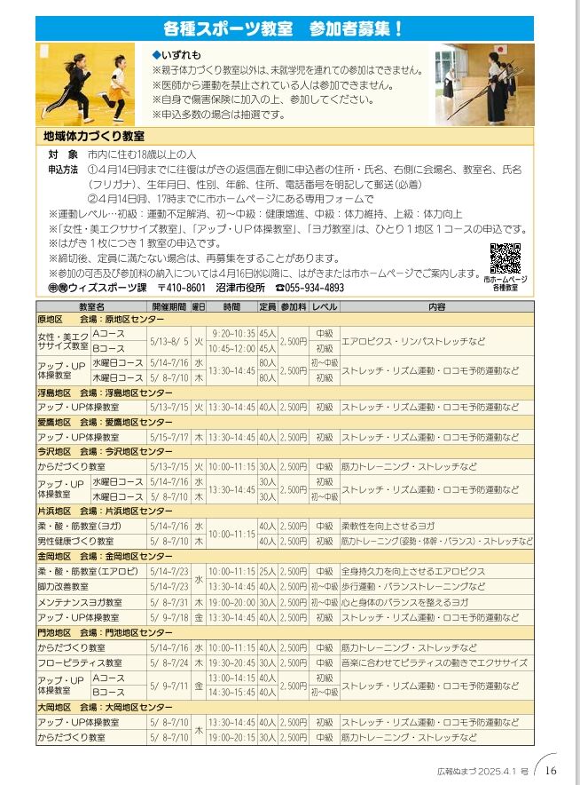第1期(4~7月)教室の募集が始まり、広報ぬまづ4月1日号に一覧が掲載されています。