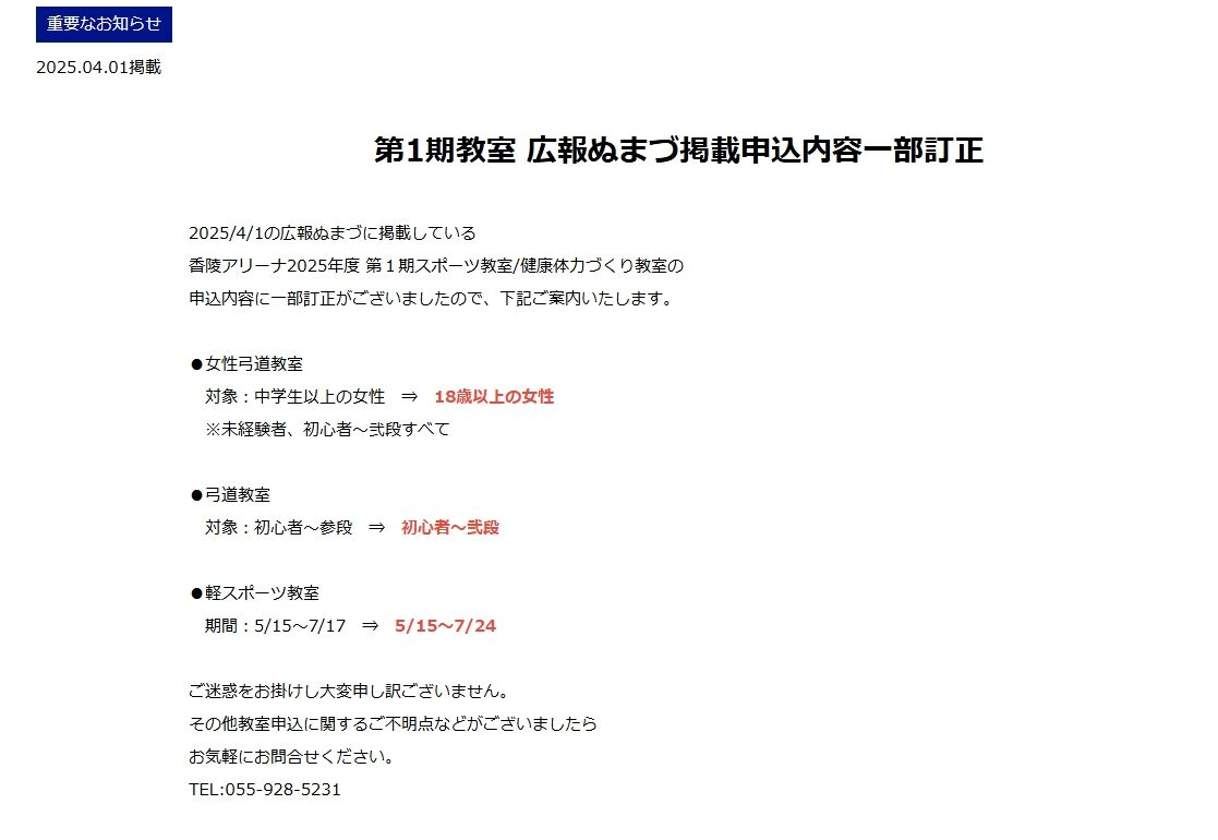 ただし、香陵アリーナのスポーツ教室については、広報ぬまづの内容から一部変更があるようです!