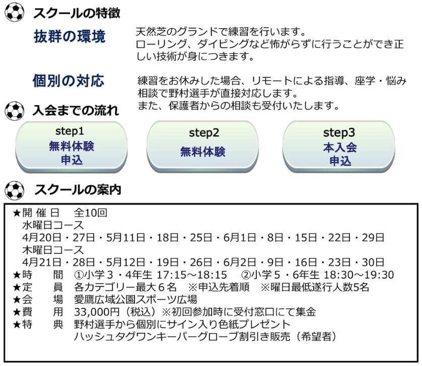 今度は、我らがアスルクラロ沼津の背番号1番 野村政孝選手による ゴールキーパースクール が開講されるので、ご紹介します!