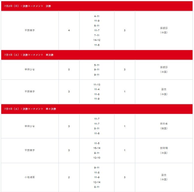 この勝利で、3位の伊藤美誠選手との差を拡げることに成功!