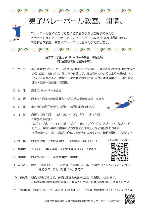 ぬまスポ調べで、中学校で男子バレー部があるのは18校中わずか7校(第三・片浜・金岡・大岡・今沢・門池・長井崎)。きっとバレーをやりたくてもできなかった子がいたはずで、これは朗報と言えるでしょう!