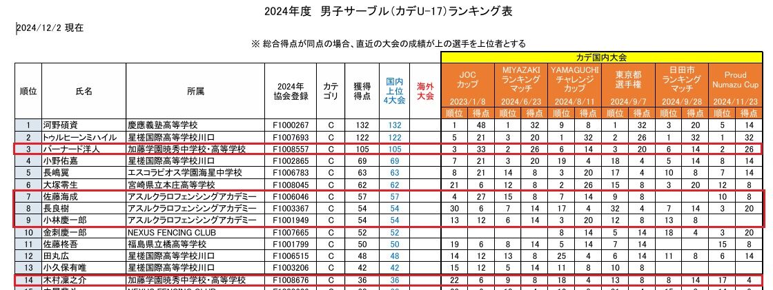 カデ日本ランキング上位にいる男子サーブルのアスルクラロFAの選手達▼