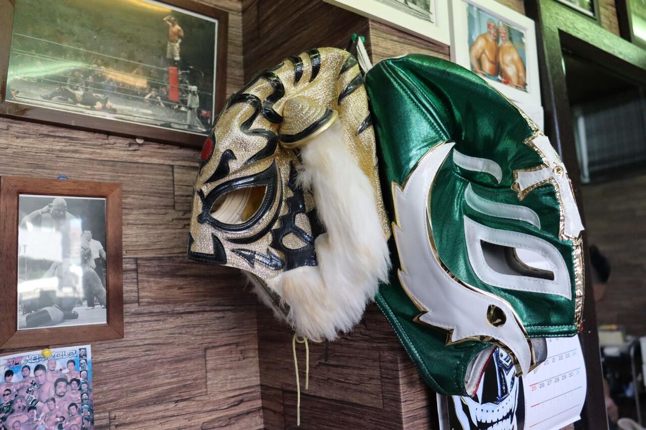 オーナーの荒木敏晴(びんせい)さんは生粋のプロレスファン。店内の壁にはプロレスの名場面が写った写真がずらりと貼られています。