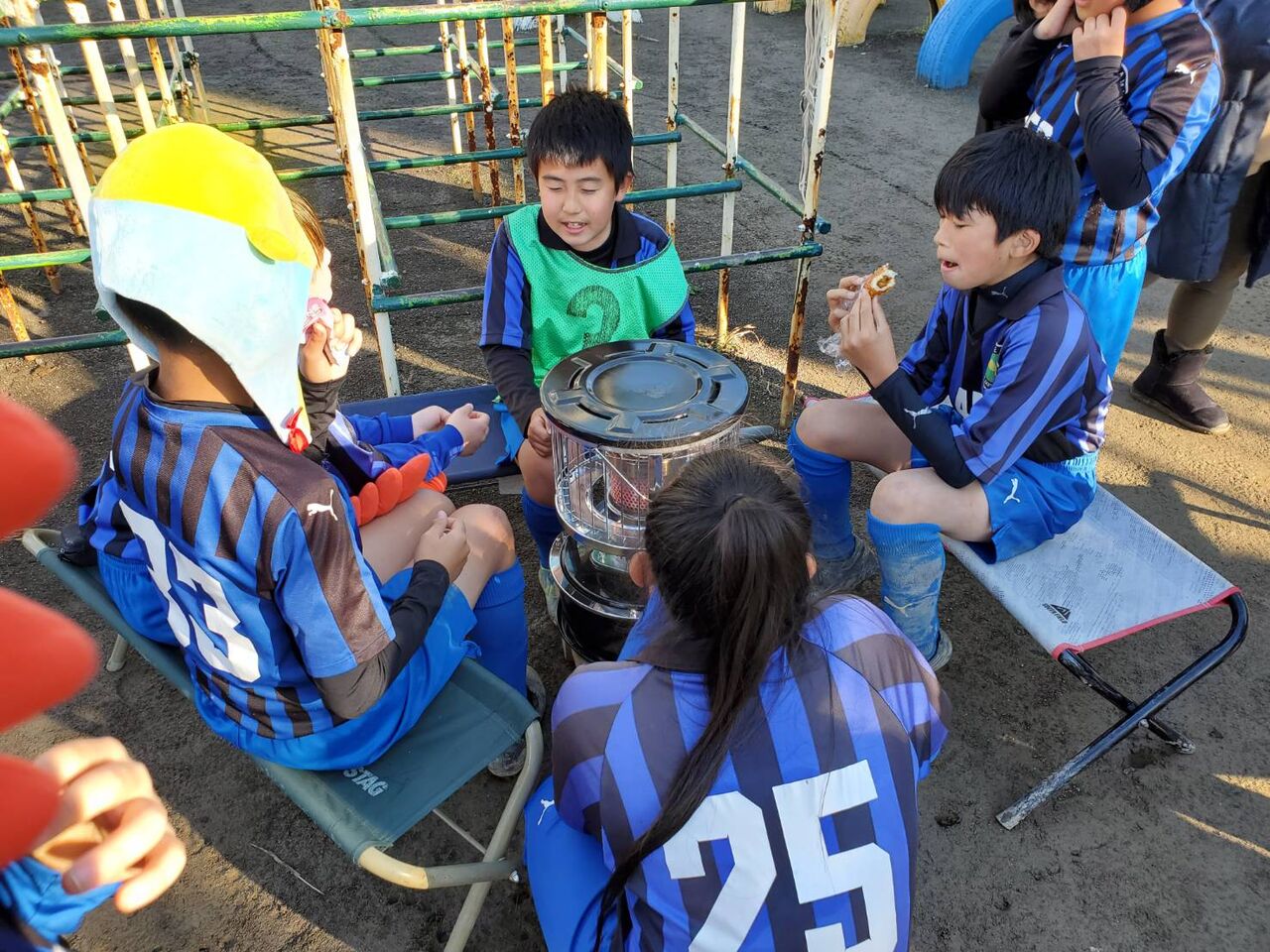 美味しそうにパンをほおばる子ども達。サッカーがもちろん上手になることも大事ですが、こうして地域の方々が関わりながら、「仲間を作っていく」「健全に育っていく」地域スポーツ(少年団)の大切さをあらためて感じました。