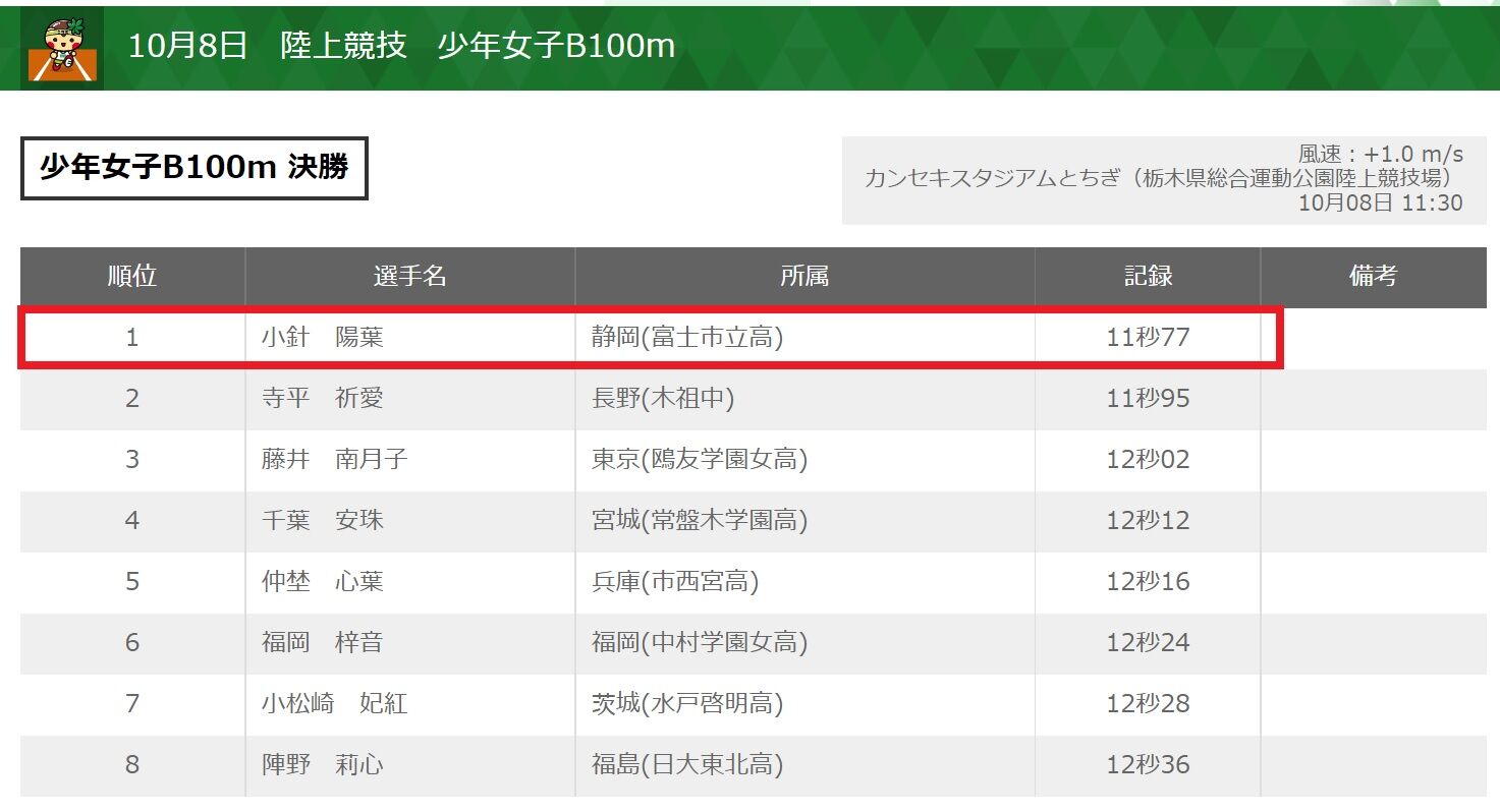 少年女子B100mに富士市立高校1年の小針陽葉選手(原中出身)が出場し、11秒77で優勝を勝ち取りました!!!ちなみに少年女子A(高校2.3年)の優勝タイムは12秒11だったので、少年女子の中で正真正銘の1位でした!