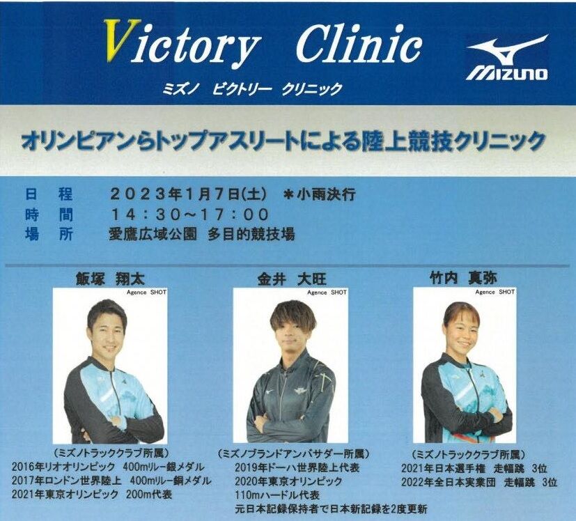 ミズノに所属している陸上選手、短距離の飯塚翔太選手、110mハードルの金井大旺選手、走幅跳の竹内真弥選手が、1月7日に愛鷹多目的競技場で中学生を対象としたクリニックを開催!