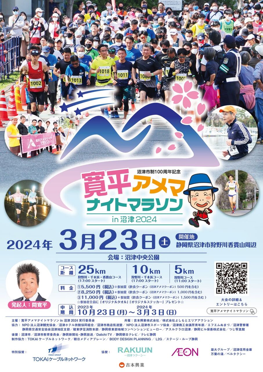 沼津を盛り上げようと吉本芸人の間寛平さんが発起人となったマラソンイベント「寛平アメマナイトマラソン」が、今年度も開催されるって!2021年から始まったので、今年で4回目!