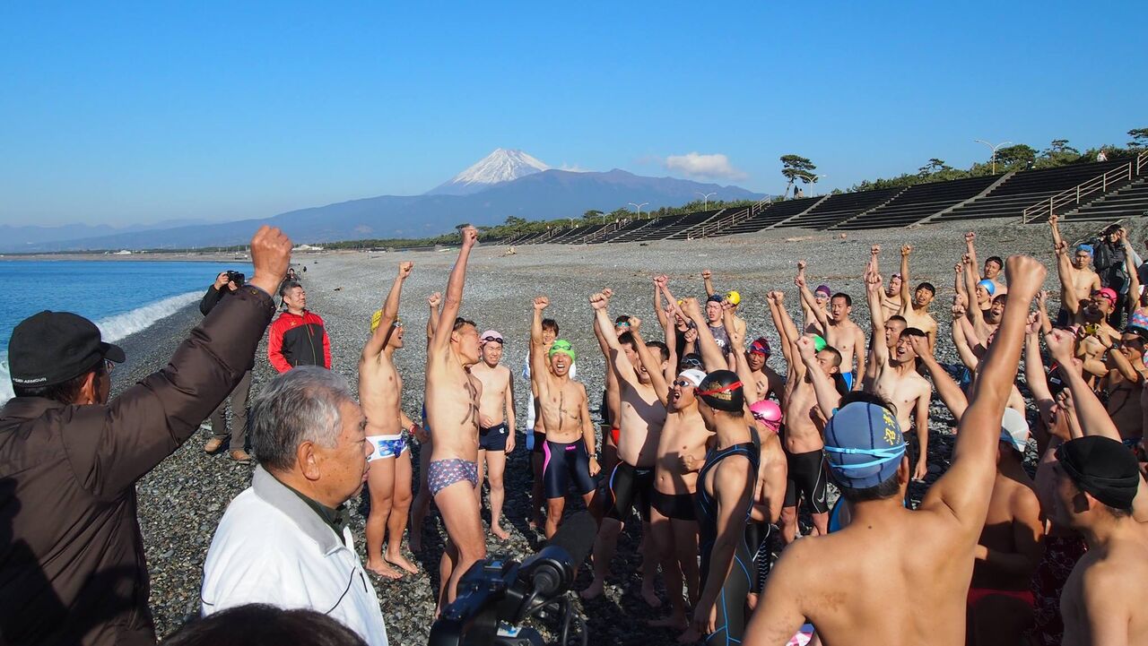寒い中、1年の健康を願い、富士山を望む千本浜海岸で泳ぎ初め。