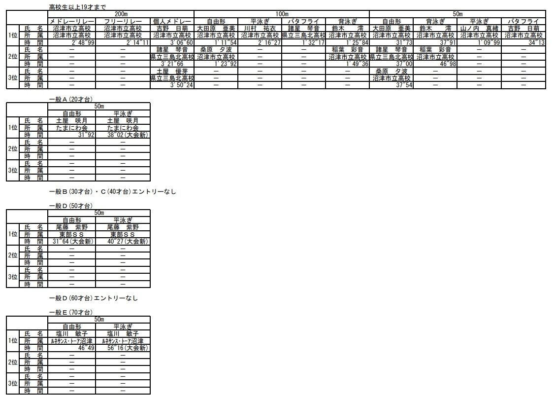 B30才台平泳ぎ50m・C40才台平泳ぎ50m・D50才台背泳ぎ50m・E60才台自由形50m・E60才台平泳ぎ50m