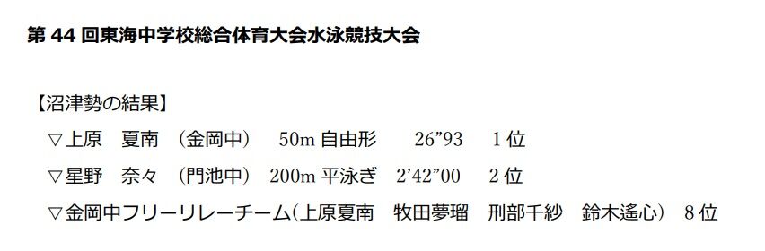 沼津勢の結果は、、、すでに全中出場を決めている上原夏南選手が50m自由形で堂々の優勝!そして上原選手率いる金岡中のフリーリレーチームも8位入賞という健闘をみせてくれました。